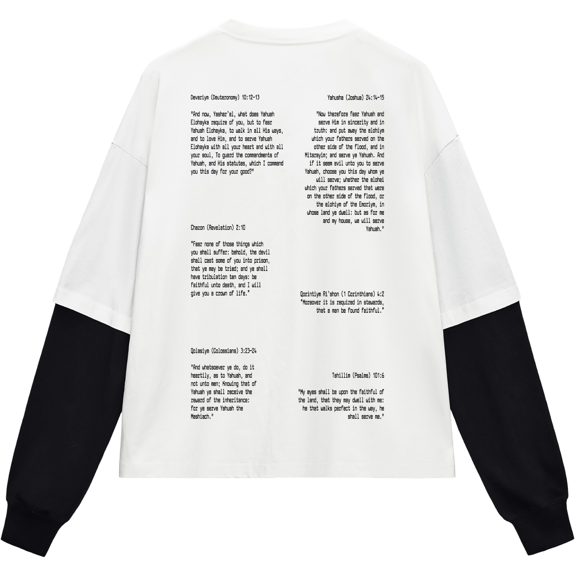 Walk in obedience and strength with the "Faithful Servant" layered style t-shirt, inspired by Devariym (Deuteronomy) 10:12–13, Tehillim (Psalms) 101:6, Qolasiym (Colossians) 3:23–24, Yahusha (Joshua) 24:14–15, Qorintiym Ri’shon (1 Corinthians) 4:2, and Chazon (Revelation) 2:10.