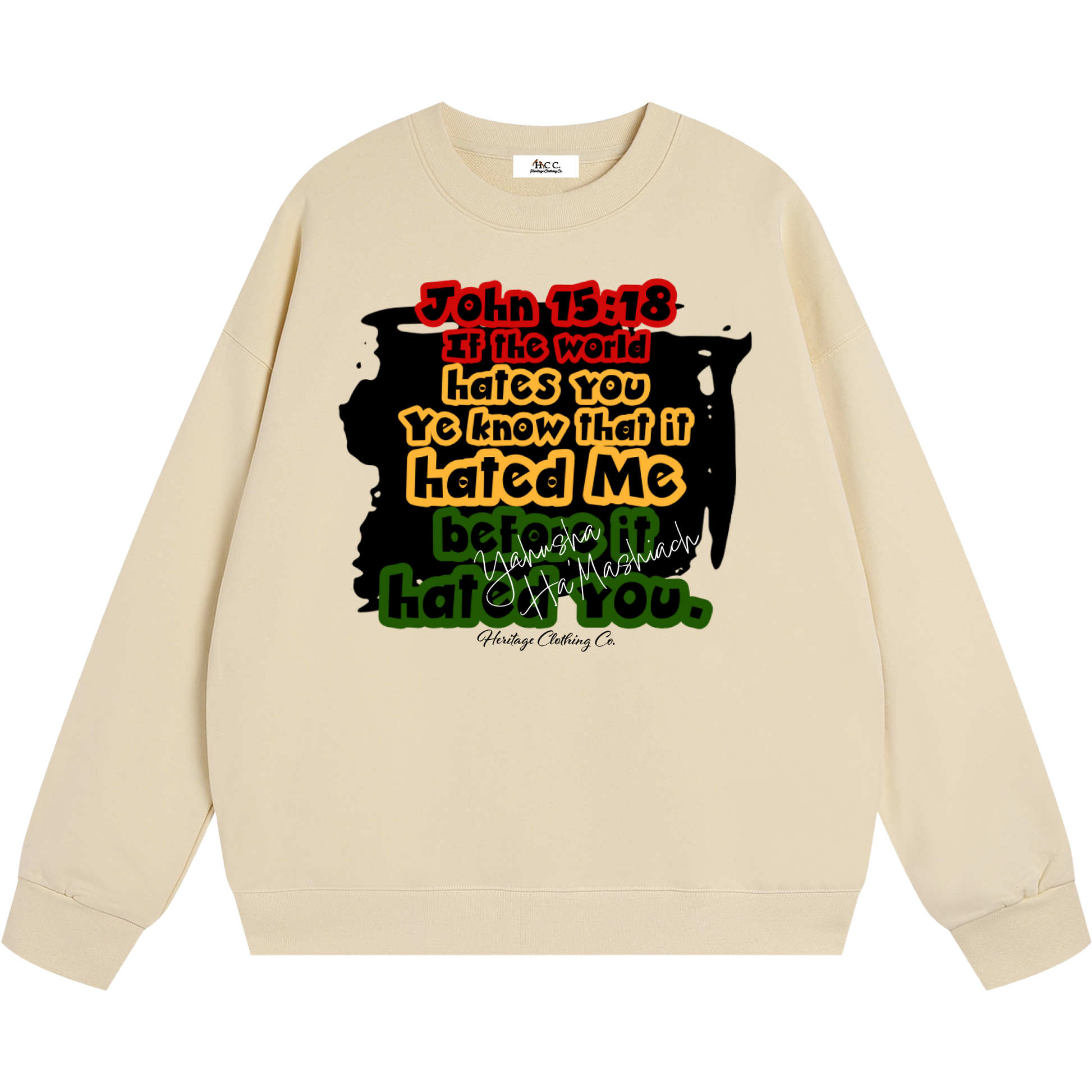 Stand strong in truth with the “Hated Me First” sweatshirt, inspired by the words of Yahusha in John 15:18: “If the world hate you, ye know that it hated Me before it hated you.”