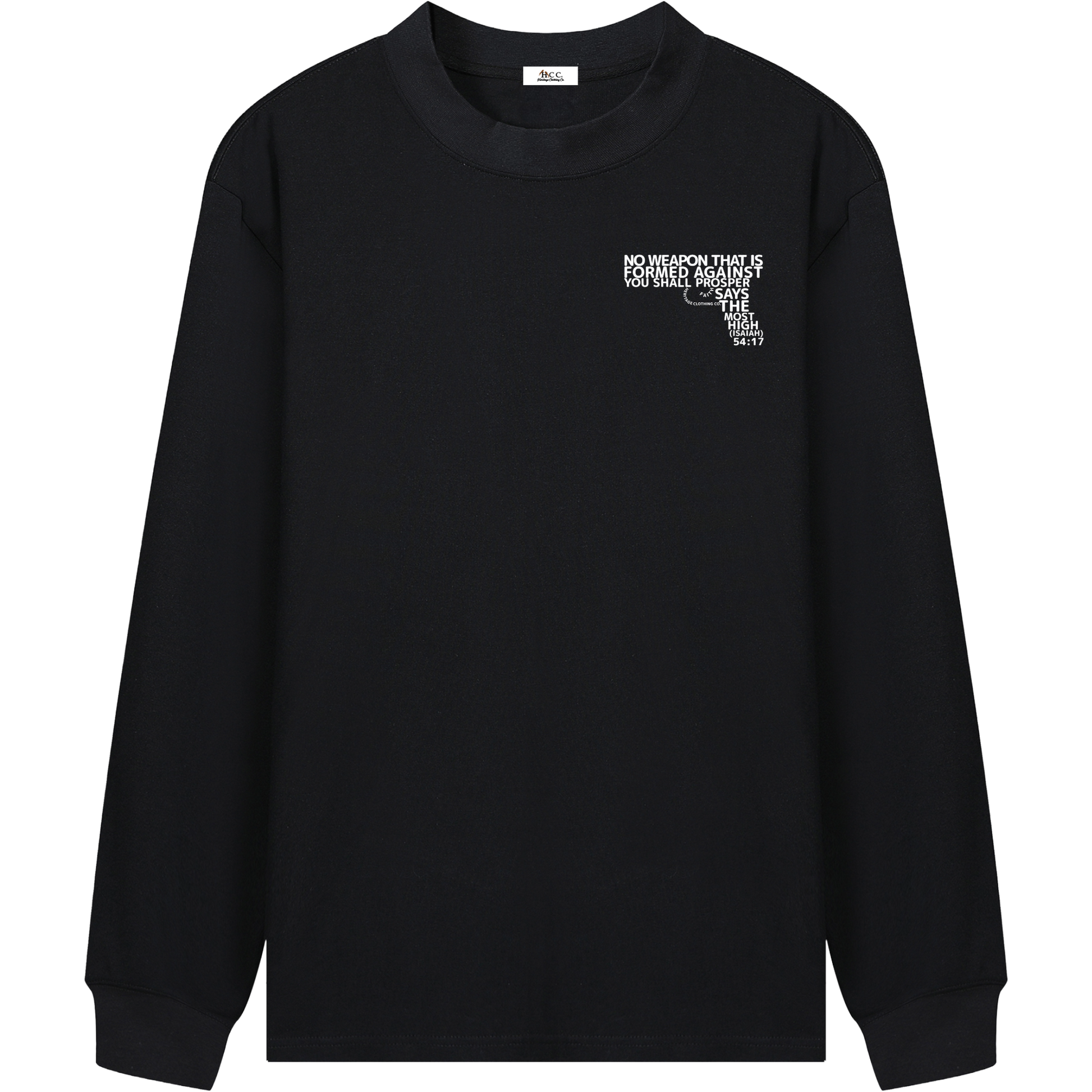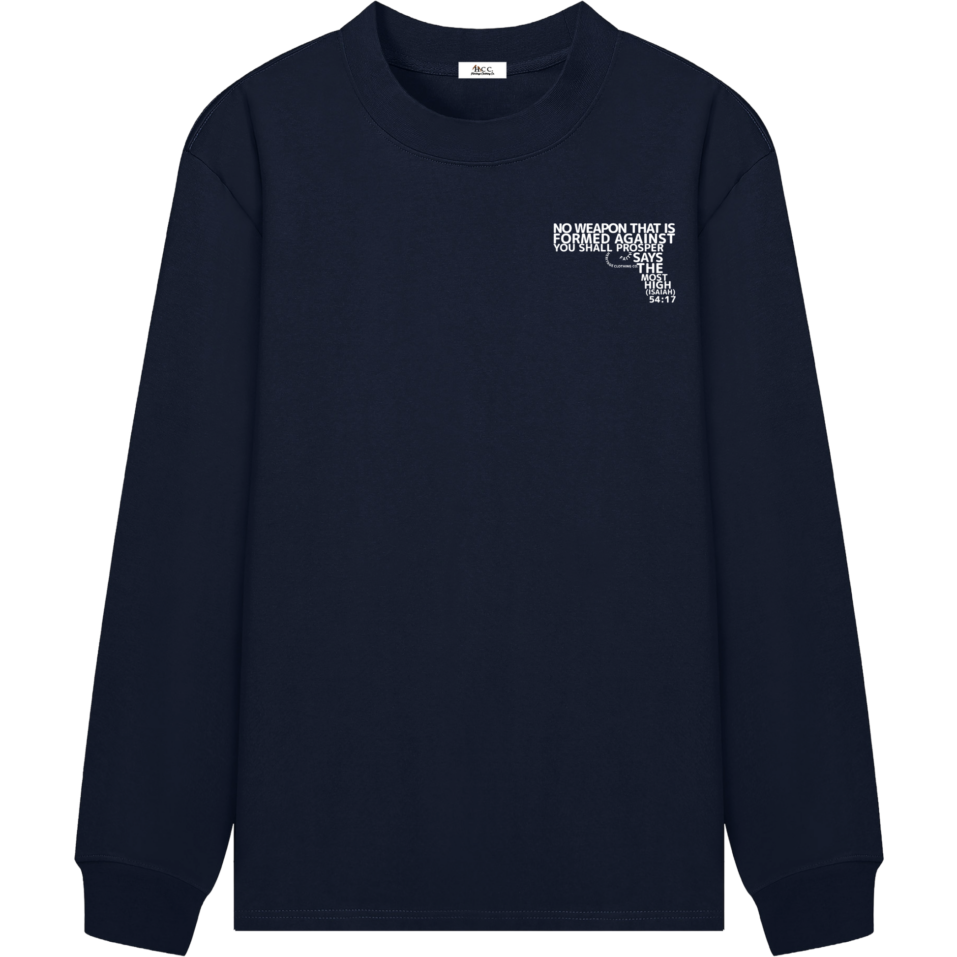 Stand firm in your faith with the “No Weapon: Armed Promise” men's essential long-sleeve t-shirt, inspired by the promise of Isaiah 54:17: “No weapon that is formed against you shall prosper.”