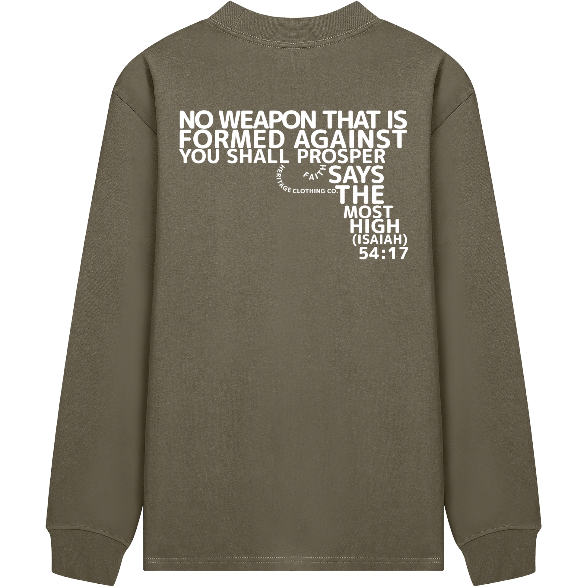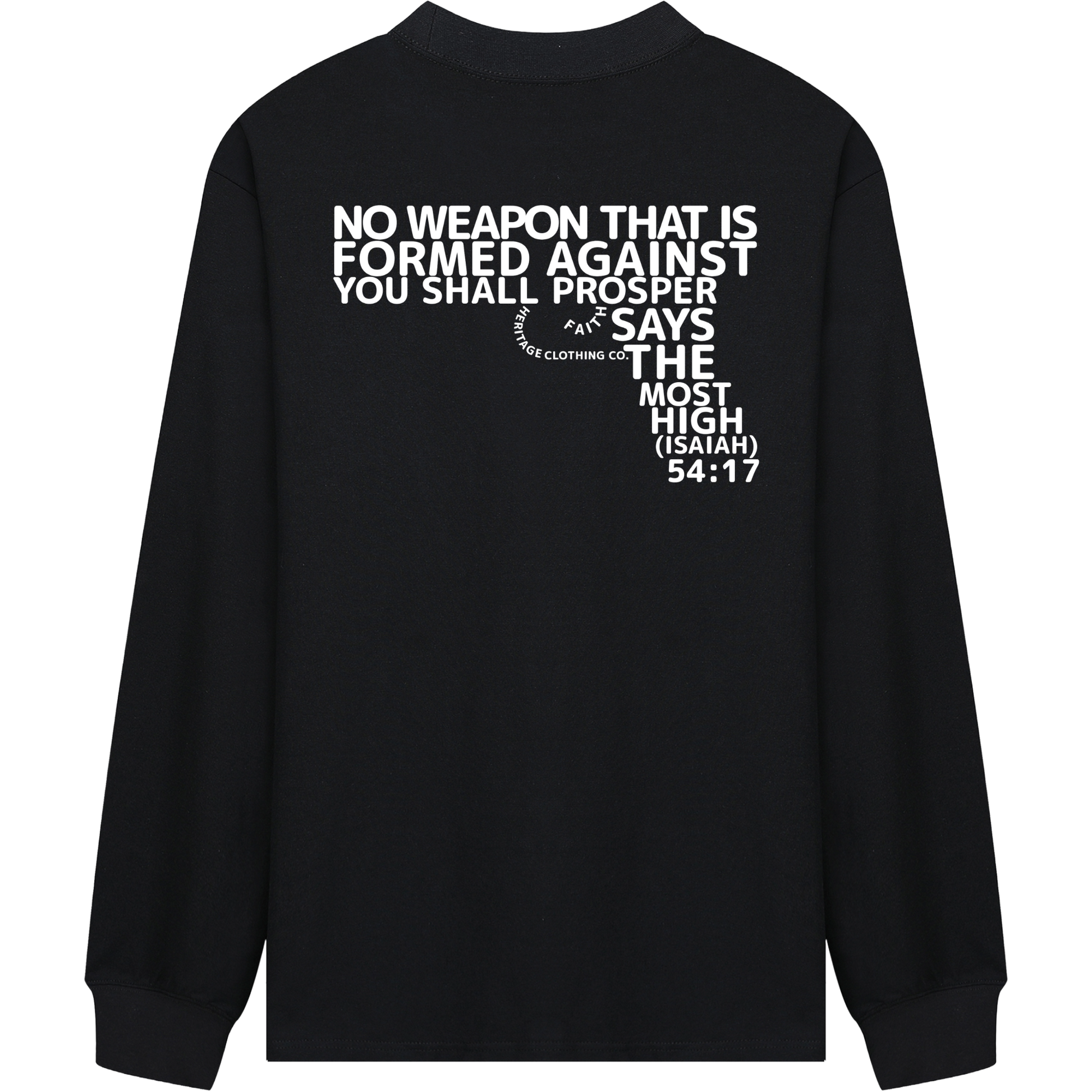The verse itself is creatively formed into the shape of a gun, turning what is meant for harm into a declaration of victory through Yahuah’s protection. Made from 100% cotton with a moderate thickness, this tee offers lasting comfort and a relaxed, loose fit. The drop-shoulder design, round neckline, and long sleeves give it a casual yet enduring style, perfect for autumn and winter.