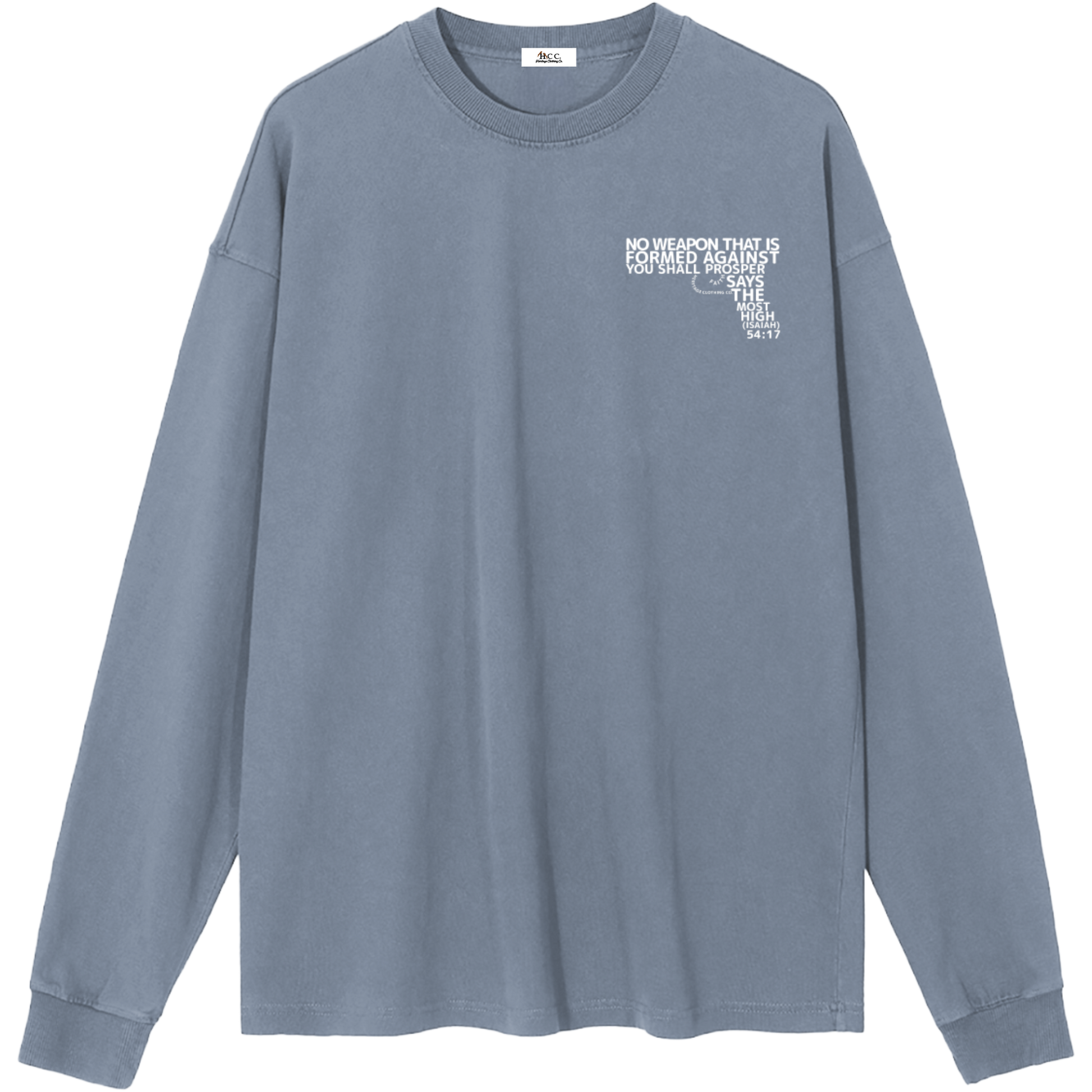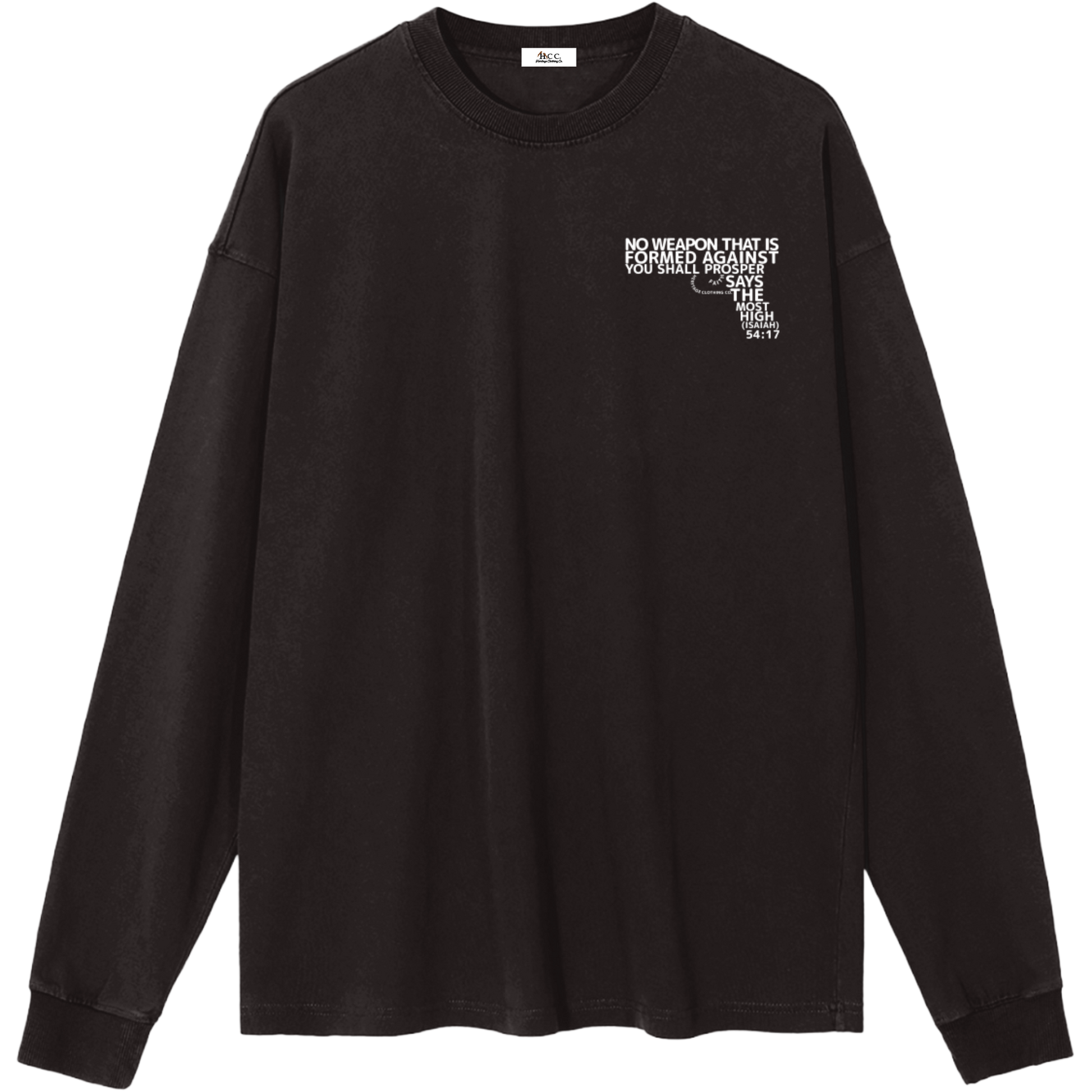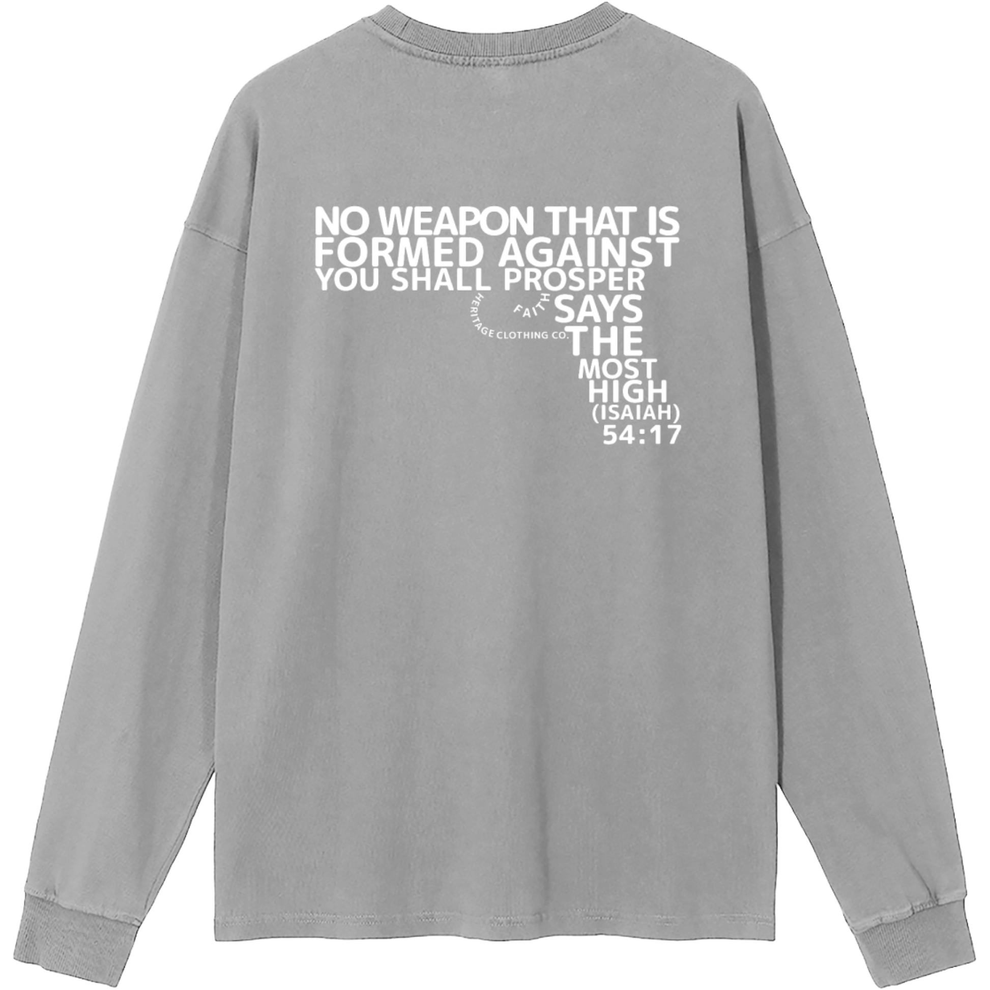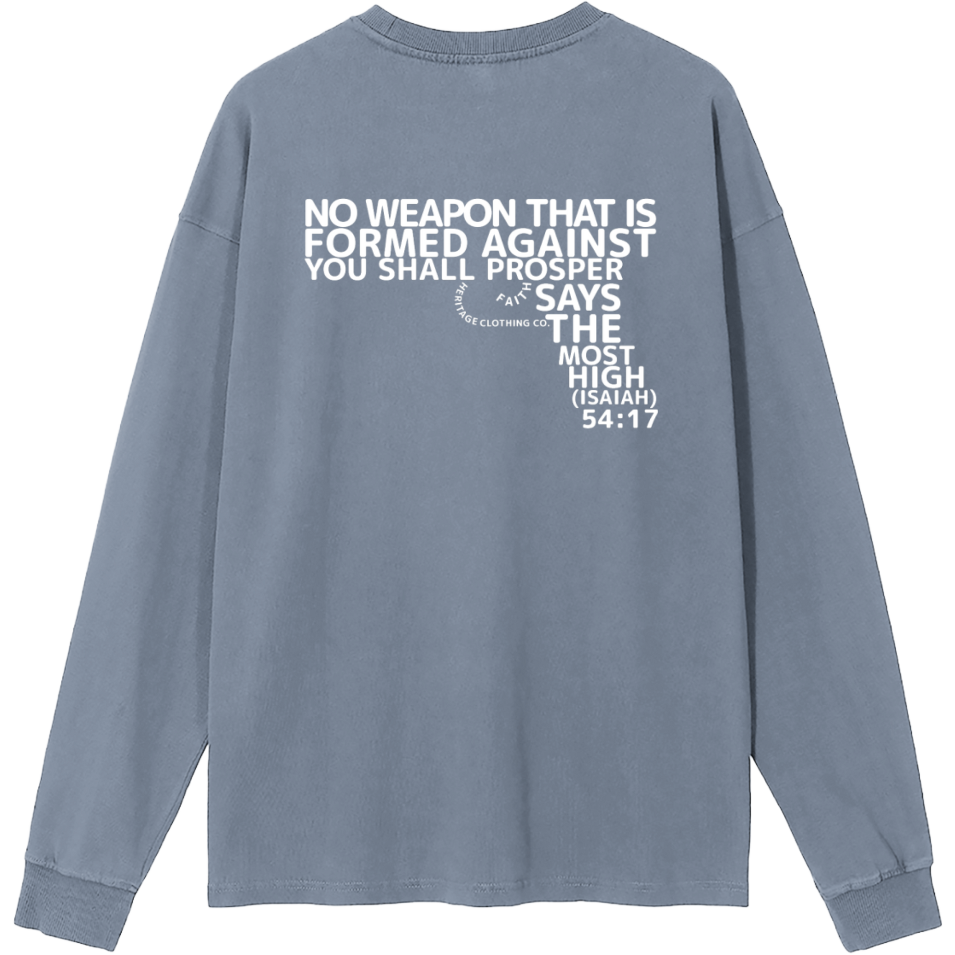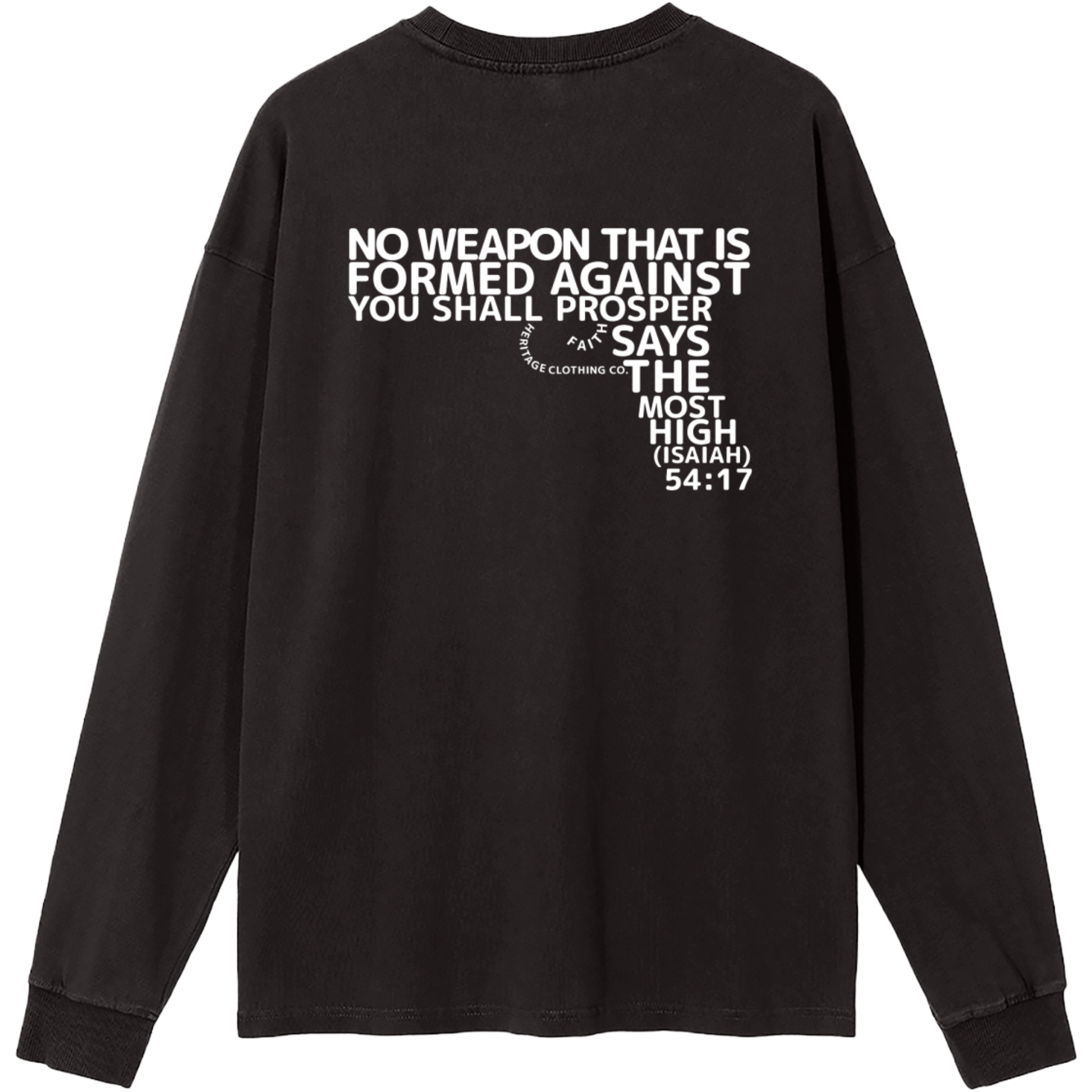 The verse itself is creatively shaped into the form of a gun, transforming what is meant for harm into a bold declaration of victory through Yahuah’s protection. Crafted from 100% cotton with a moderate thickness, this long-sleeve essential offers breathable comfort and a relaxed, regular fit.