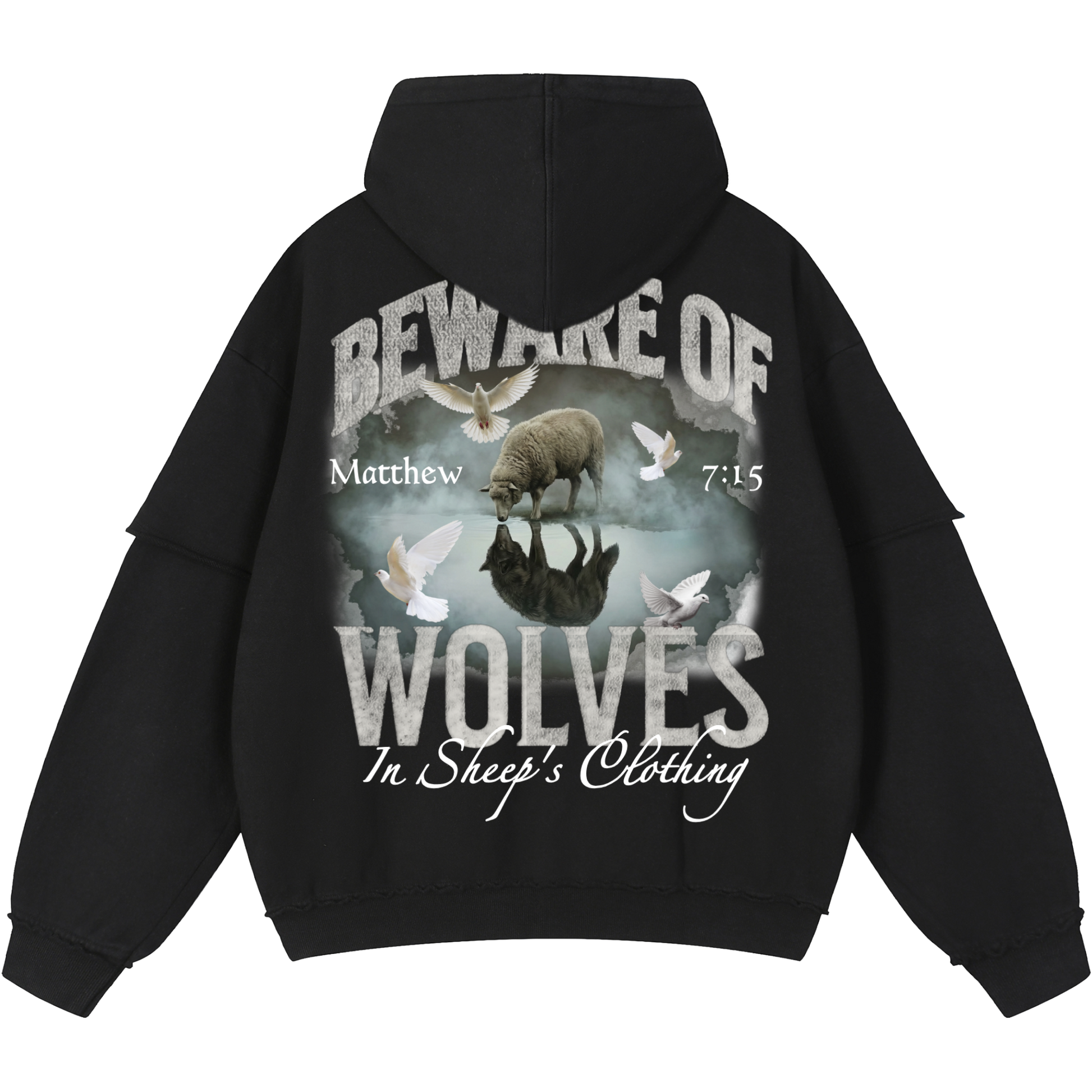 "Wolves In Sheep’s Clothing" men’s double layered hoodie — a statement piece rooted in awareness, reflecting the warning recorded in Matthew 7:15 to beware of those who disguise threat behind imitation and hidden intent.