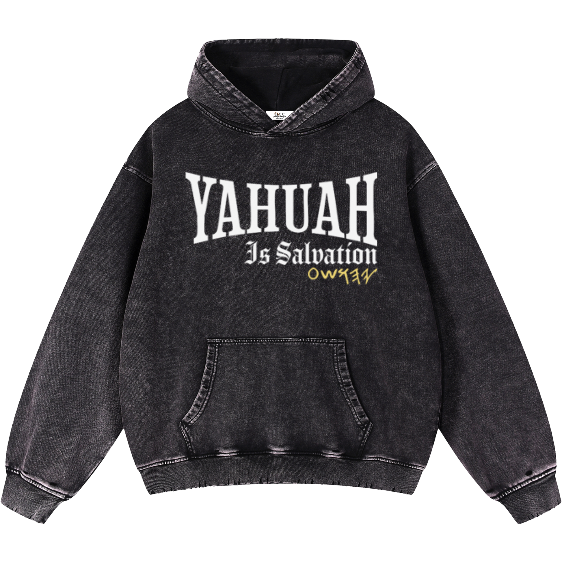 The hoodie features a relaxed drop-shoulder fit, a soft hood, a front pocket, and frayed vintage detailing for a timeless, lived-in look. The sweatpants offer a comfortable mid-waist fit, adjustable drawstring, and relaxed silhouette for effortless wear. Together, they embody strength, modesty, and peace — the covering of one who trusts fully in Yahuah’s salvation, Yahusha.